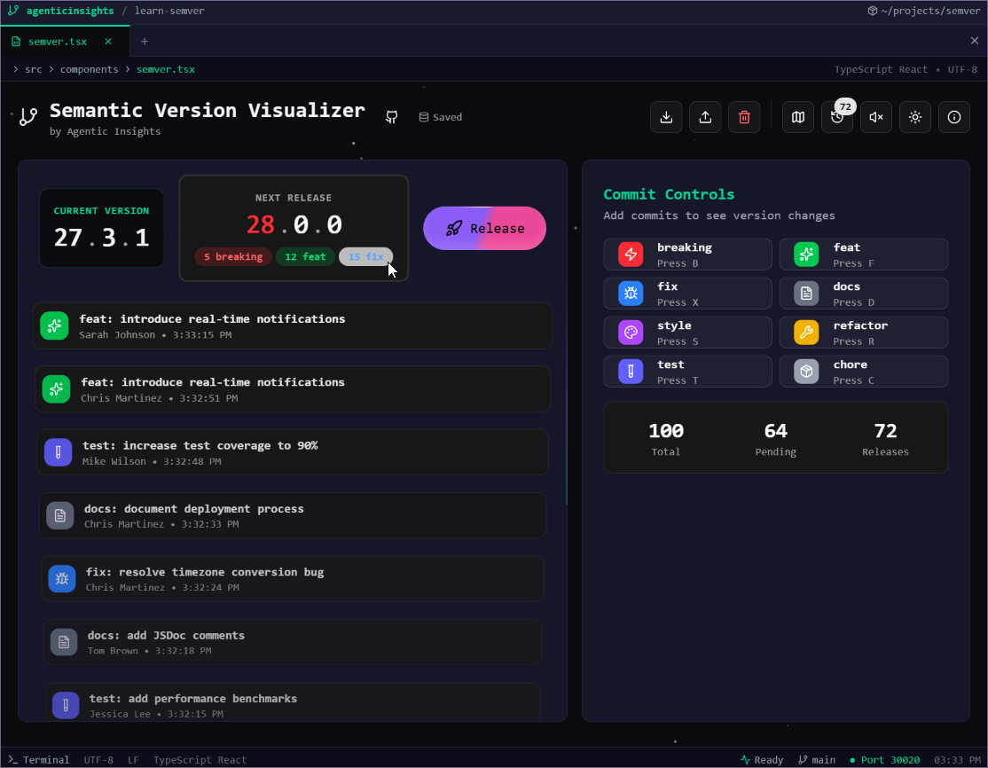 The entire learn-semver application was built in under two hours using Claude Code, demonstrating a practical prototyping method where AI agents handle implementation details while developers focus on vision and user experience. Built with Next.js, ShadCN, and MagicUI, it follows the design patterns we're exploring at Agentic Insights – clean, interactive, and compelling.