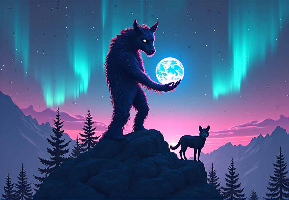 'World Wildlife Day night, Neo-Pop style: a mythical guardian of endangered species, stands atop a digital mountain, surrounded by pixelated wildlife and neon auroras. In its hands, it cradles a glowing orb representing Earth's biodiversity, casting vibrant reflections across the scene.'
