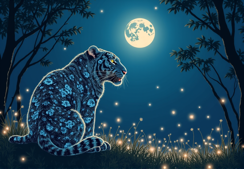 'World Wildlife Day night, Incoherents style: an anthropomorphic tiger with translucent skin patterns, orchestrates a symphony of nocturnal creatures beneath a moonlit sky. Luminescent fireflies form musical notes around, as constellations mirror the forest's harmony.'
