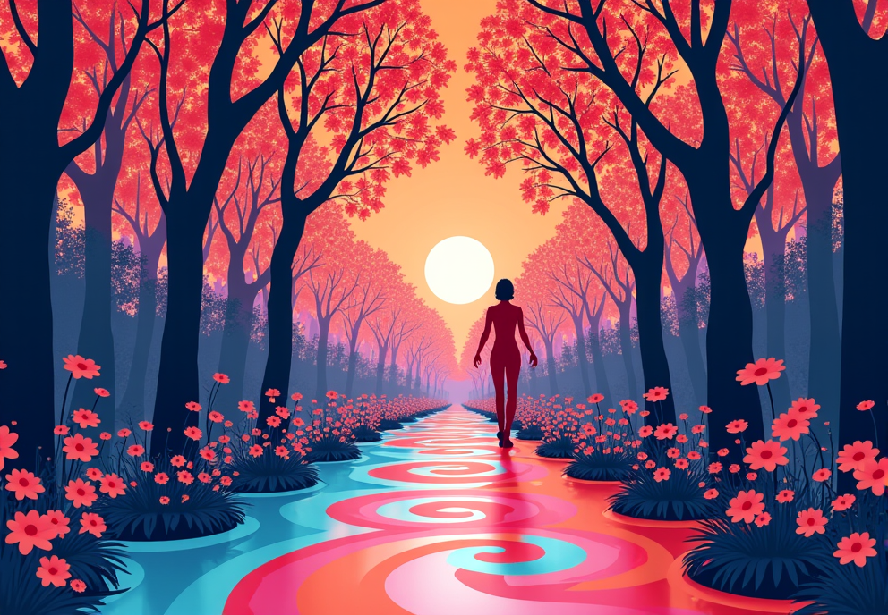 Approaching International Women's Day, in the style of Op Art: Vibrant garden labyrinth with optical illusions, a sentient tree guiding women through paths of geometric patterns and shifting colors.
