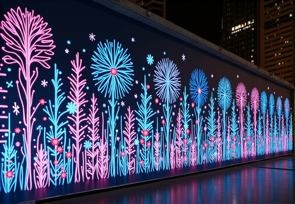 Memphis Design night, World Wildlife Day: an animated mural on city walls, neon geometric patterns swirl around, bold colors illuminate urban jungle, creatures leap across skyscrapers, playful patterns animate wildlife celebration.