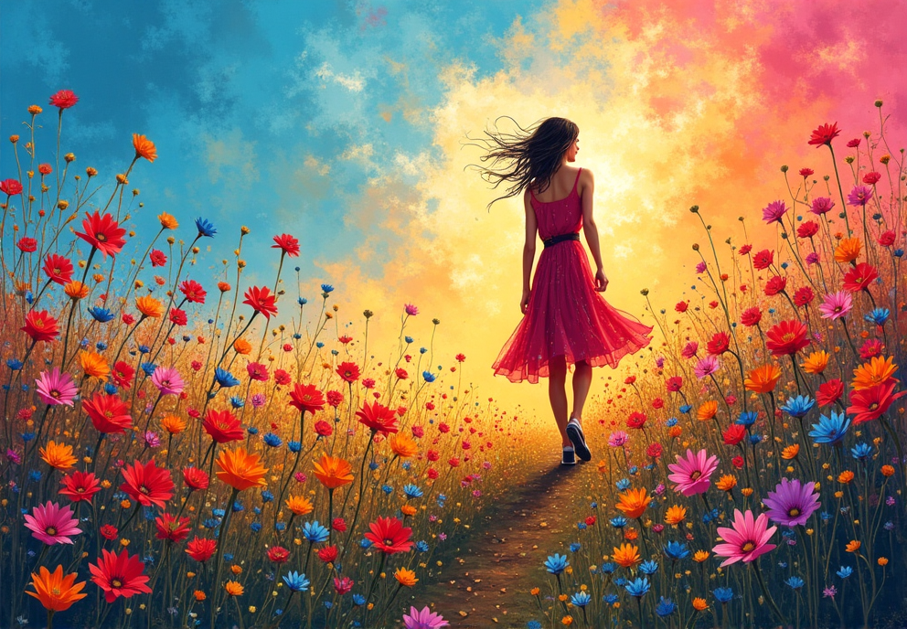 International Women's Day afternoon, Action Painting style: A vibrant garden of courage and dreams where they blooms amidst bold colors, swirling with energy as she paints trails of empowerment through a field of wildflowers under a kaleidoscope sky.