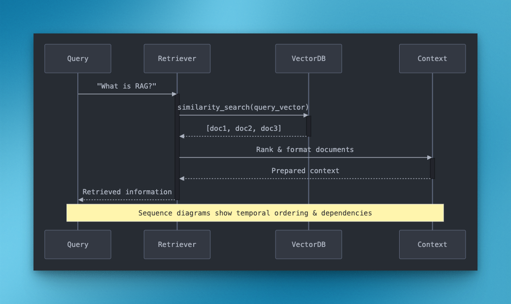 Sequence diagrams prove invaluable for disambiguating software workflows that would otherwise require extensive back-and-forth to piece together in every coding conversation. By providing these upfront, you eliminate the cognitive overhead of repeatedly explaining system interactions. Most agentic coding tools now automatically inject date and time into their context flow, but if yours doesn't, this simple addition provides crucial temporal anchoring for the AI.